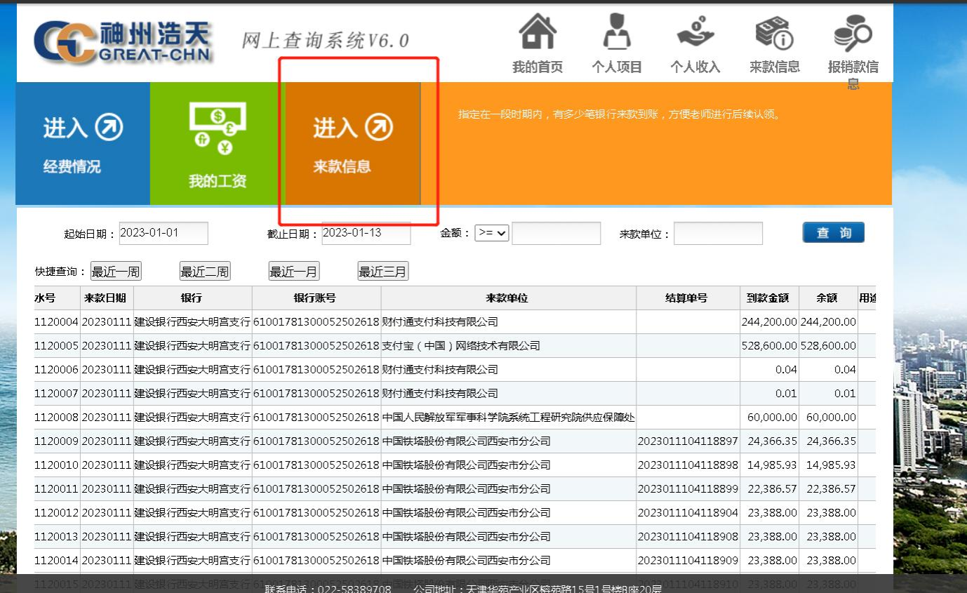 第二步:点击“来款信息”,进入页面后,可根据时间、金额、来款单位等信息查询来款是否到账。(如图二所示)